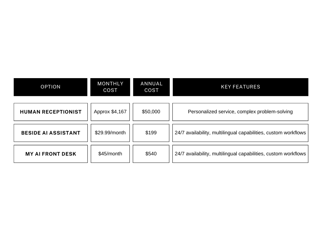 When considering the financial implications of hiring a human receptionist or an AI assistant solution, the cost savings are substantial. Here's a breakdown of the typical costs associated with each option: